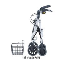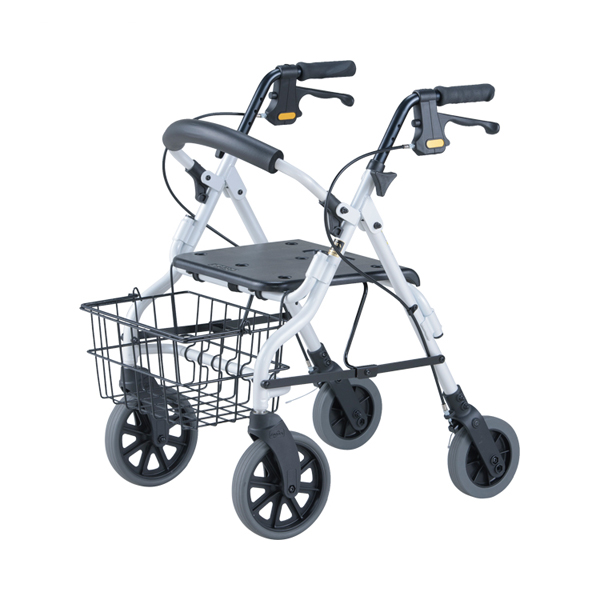 ・歩き疲れた際に座れる大型座面と、お買い物などに便利な着脱式のかご付き歩行車