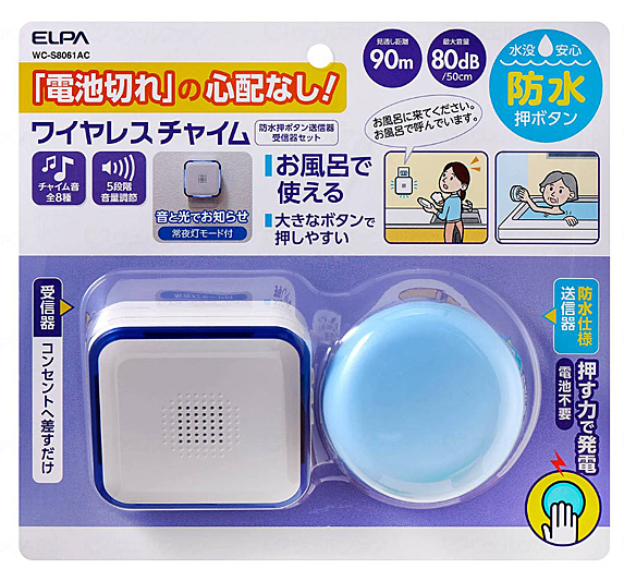・受信器はコンセントに差し込むだけ、送信器は押す力で発電するので電池不要です。