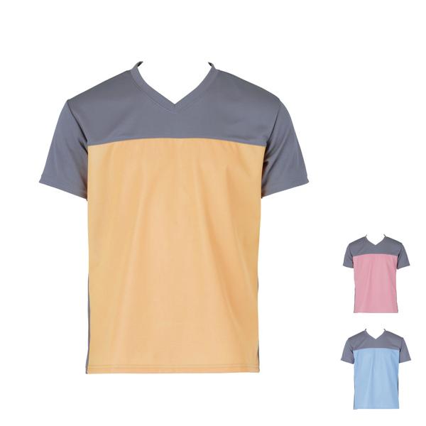 ・通常のTシャツ姿では、入浴介護の際に濡れて衣類が重くなる・冷える・着替えが大変で困るとの問題から、防水・はっ水・吸水速乾・着脱簡単ストレッチ素材を組合せ商品化しました。