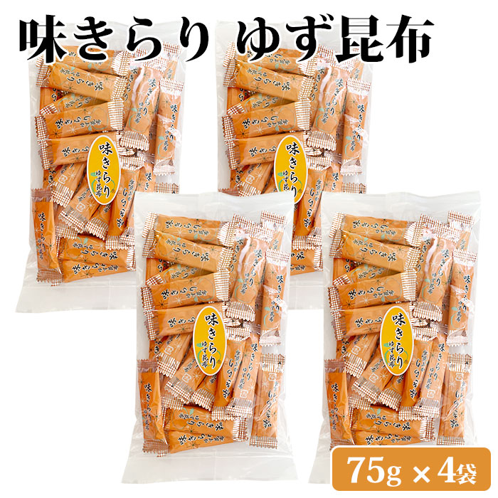 送料無料 味きらりゆず昆布 75g ×4袋 北海道産 おつまみ昆布 おやつこんぶ 個包装 昆布 こんぶ おつまみ おやつ 昆布菓子 珍味 ゆず 柚子