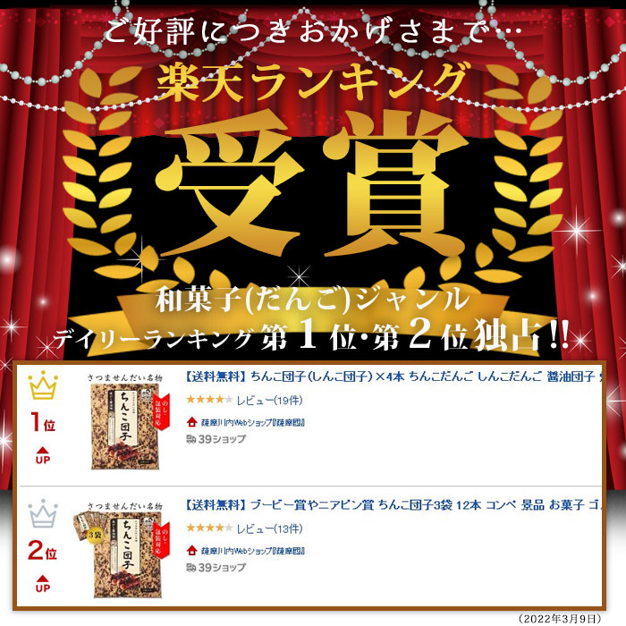 | 商品説明 | ゴルフコンペの景品、ブービー賞やニアピン賞にオススメのちんこ団子2袋 常温で180日間保存可能。 薩摩川内周辺では、しょうゆを塗った焼き団子の事を、昔から「ちんこ団子」と呼んでいます。 小さい頃におばあちゃんが作ってくれた。 いまでも焦げたしょうゆの香りで思い出す。 もちもちのお団子にしょうゆを塗って 繰り返し焼いた、懐かしのちんこ団子。 開封後は袋のまま電子レンジに入れて、「ポンッ」と音がするまで温めてください。 音がすればあたため完了です。 皿に移して、別添の醤油だれをかけてお召し上がりください。 ※予告なくパッケージが変更となる場合がございます。予めご了承ください。 |