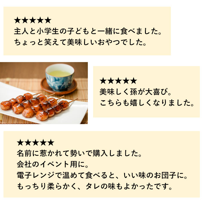 | 原材料名 | 【団子】上新粉(うるち米(国産))、醤油(小麦・大豆を含む)、砂糖/トレハロース、カラメル色素、香料、調味料(アミノ酸等)、甘味料(ステビア、カンゾウ) 【たれ】醤油(小麦・大豆を含む)、砂糖/カラメル色素、香料、調味料(アミノ酸等)、甘味料(ステビア、カンゾウ) |