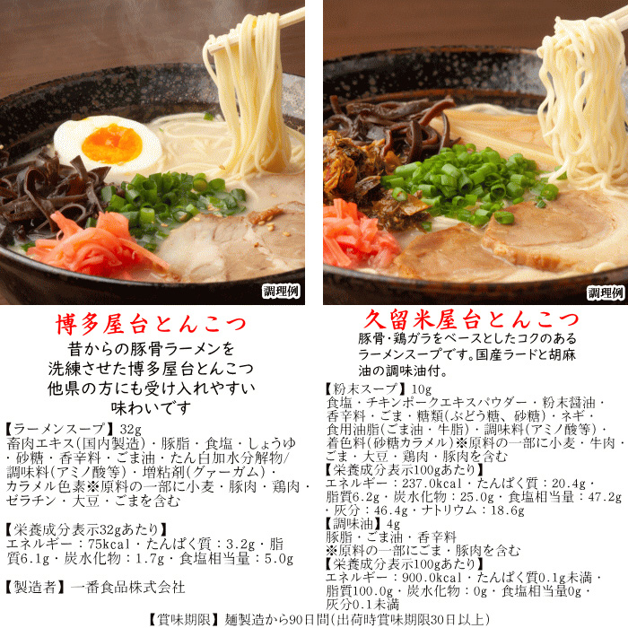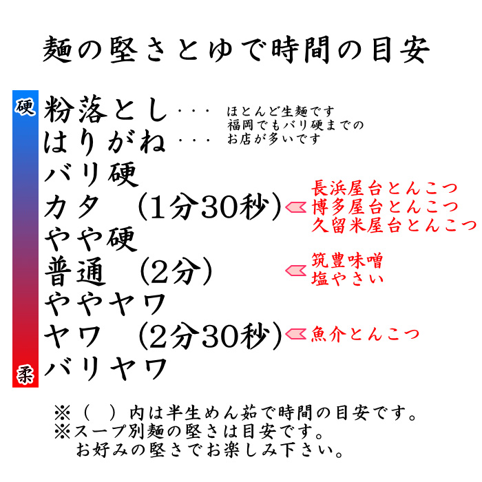 ※麺は全て同じ博多細麺です。麺のゆで時間でお好みの堅さに調整してお楽しみ頂けます。