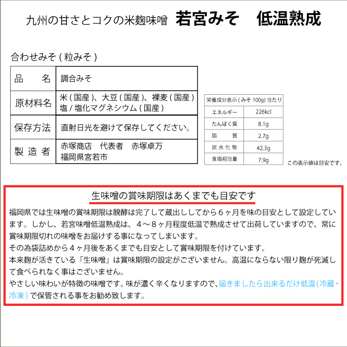若宮みそ 低温熟成 は低温でじっくりと熟成させる事で、米麹の甘味と大豆のコクを最大限に引き出しながら辛さを抑えた特上味噌です。