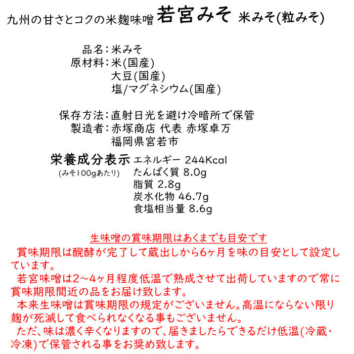 ※ 生味噌は消費期限がございません。高温で麹が死なない限り味噌が腐って食べられなくなる事はございません。