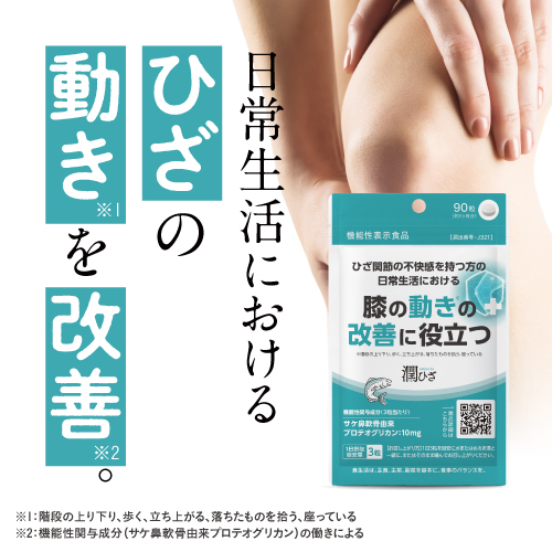 | 機能性表示 | 本品にはサケ鼻軟骨由来プロテオグリカンが含まれます。サケ鼻軟骨由来プロテオグリカンには、膝関節の不快感を持つ方の軟骨成分の分解を抑え、関節軟骨の保護に役立ち、膝関節の可動性、日常生活における膝の動き(階段の上り下り、歩く、立ち上がる、落ちたものを拾う、座っている)の改善に役立ち、起床時の膝の違和感を軽減することが報告されています。 |