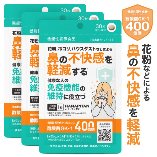 | 商品特徴 | 花粉やホコリなどによる鼻のムズムズ・グズグズ(※1)でお悩みの方に。 鼻の不快感と免疫機能をWでサポ−トする酢酸菌GK-1を400億個(※2)配合した、医師監修の機能性表示食品です。 酢酸菌は、お酢を作る工程で必要不可欠な菌です。 ■鼻の不快感を軽減 機能性関与成分「酢酸菌GK-1」が、鼻の不快感に関係する細胞のバランスを整えることで、不快感を軽減。 鼻のムズムズ・グズグズ(※1)で、デリケートな日々を過ごしているあなたに。 【 菌活(※3) 】で花粉の季節もおだやかに!年中スッキリおだやかな日々へ。 ■免疫機能の維持に 酢酸菌GK-1の『健康な人の免疫機能の維持に役立つ』機能性表示が追加されてリニューアル。 酢酸菌GK-1の摂取により、免疫の司令塔であるpDC細胞が活性化し、外敵と戦う免疫機能が維持される働きがあると推定されています。 ◇着色料・香料・甘味料・増粘剤・コーティング剤・栄養強化剤・ゲル化剤または糊料 不使用 (※1)鼻の不快感のこと (※2)1日目安量1粒あたり (※3)体に良い働きをする菌を積極的に食事から取り入れること |