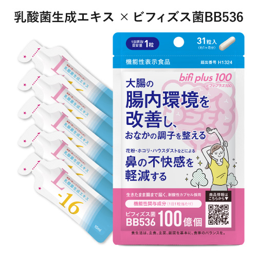 商品名/内容量 | ・ビフィプラス100 31粒(約1ヶ月分) ・乳酸菌生成エキス L-16 10ml×5包 ●配合成分につきましては、上記の商品名をタップしてご確認ください。 |