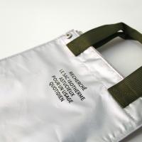 | 商品説明 | マットな質感のシルバー生地にシンプルなロゴプリント入りのデザイン。 1人使いにちょうどいいサイズの保冷ランチトート。内側には保冷剤を入れられるメッシュポケット付き。 折り畳めるようにスナップボタンが付いているのでコンパクトに持ち運べて収納時も便利です。 |