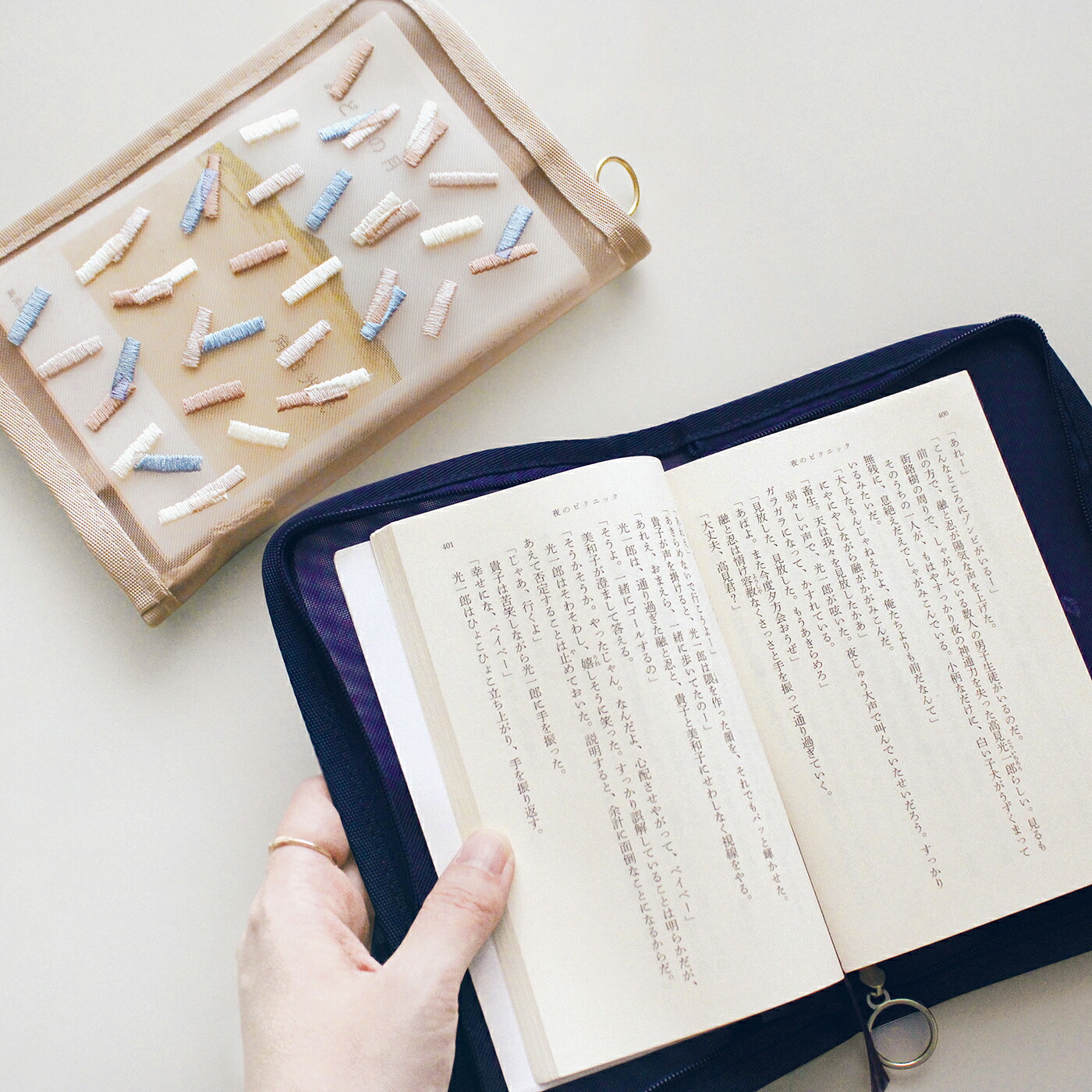 | 透け感のあるメッシュ生地に刺繍をあしらった文庫サイズのブックカバー。 ラウンドファスナーなのでカバンの中でも本が開かないように持ち運ぶことができ、開けばそのまま本を読むことができます。 軽やかな素材感とやさしい刺繍が、本の表紙をさりげなく彩り、読む時間をより心地よいものにしてくれます。 | |