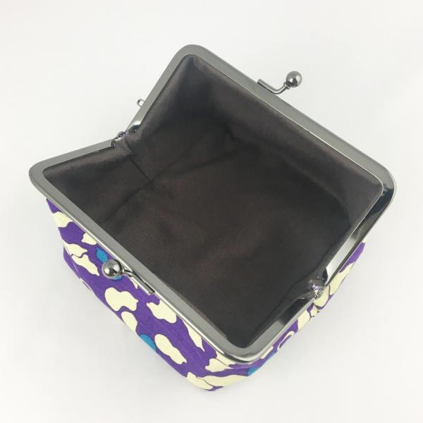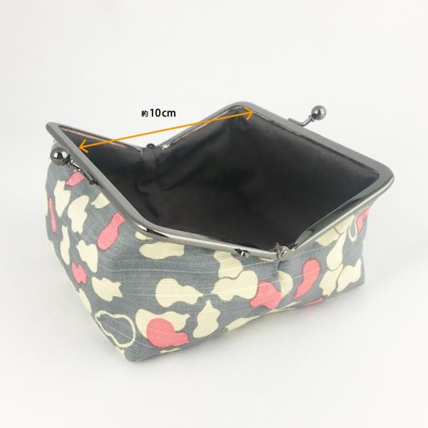 やや張りのある生地を使用。口が大きく開くので中が見やすく、物の出し入れがスムーズにできます。コスメ以外にも小物入れとしてもお使いいただけます。黒メッキ色の口金が高級感を演出します。口金にチャームなどが付けられるカンが一つ付いています。