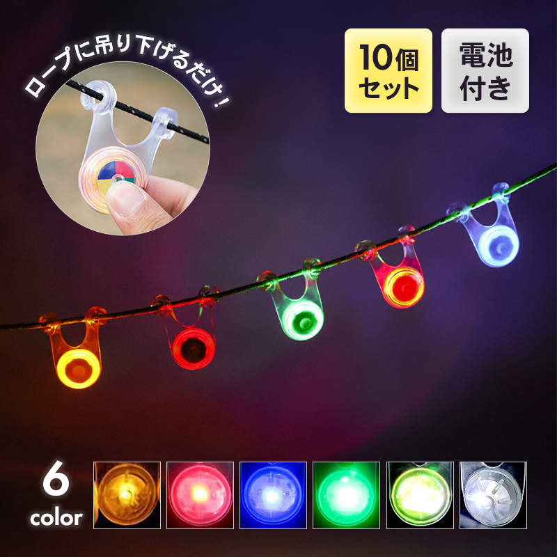 ロープライト LED 10個セット アウトドア キャンプ カラー 安全 取り付け 簡単 防水 ブルー テント タープ 吊り下げ ペグ 夜間 電池 点滅 ペット
