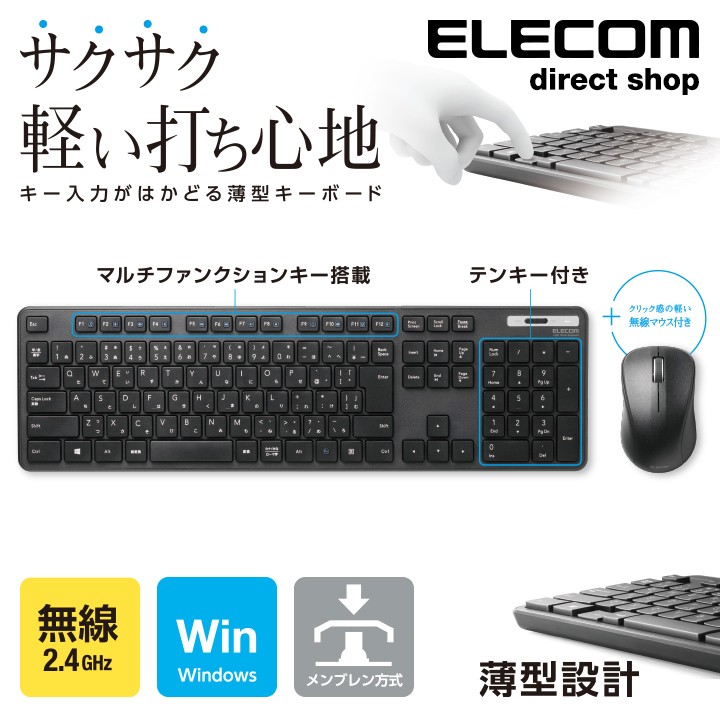 商品名 | エレコム 無線 薄型 フル キーボード & マウス ワイヤレス メンブレン式 無線キーボード フルサイズ マウス付 ブラック┃TK-FDM110MBK |