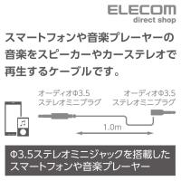 仕様 | ■対応機種:φ3.5mmステレオミニジャック搭載のスピーカー・ヘッドフォン・カーナビ・カーステレオおよびφ3.5mmステレオミニジャック搭載のスマートフォン・ポータブルオーディオプレーヤーなど ■コネクタ形状1:φ3.5mm 3極ミニプラグ(L字) ■コネクタ形状2:φ3.5mm 3極ミニプラグ(ストレート) ■プラグメッキ仕様:金メッキ ■カラー:ブラック ■長さ:1.0m ■環境配慮事項:EU RoHS指令準拠(10物質) |
