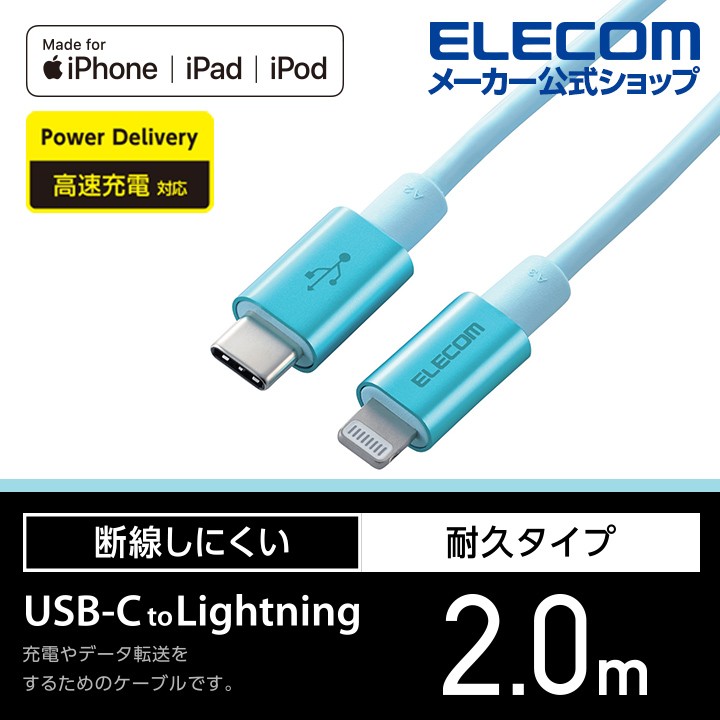 商品名 | エレコム USB-C to Lightningケーブル 耐久仕様 タイプC ライトニング ケーブル 断線しにくい 準高耐久 ライトニングケーブル 充電 2.0m ブルー┃MPA-CLPS20BU |