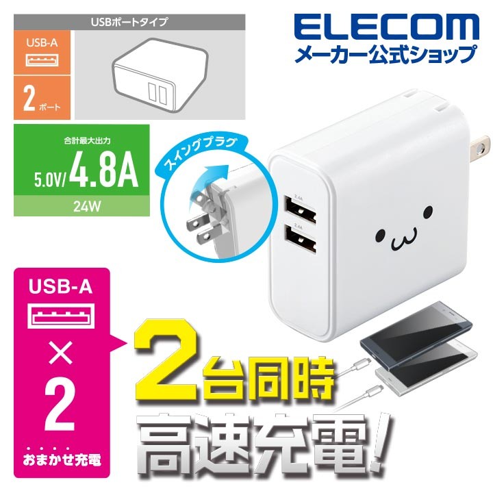 商品名 | エレコム スマートフォン ・ タブレッ ト用 24W AF×2 AC 充電器 4.8a出力 usb-Aメス 2ポート タイプA おまかせ充電搭載 ホワイトフェイス┃MPA-ACU05WF |