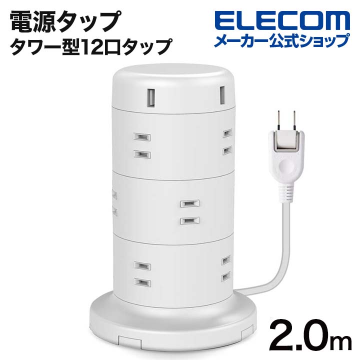 商品名 | エレコム 電源タップ タワー型12口タップ2m コードタップ コンセント 延長コード タップ OAタップ 延長ケーブル コード ホワイト 約2.0m┃ECT-0720WH |
