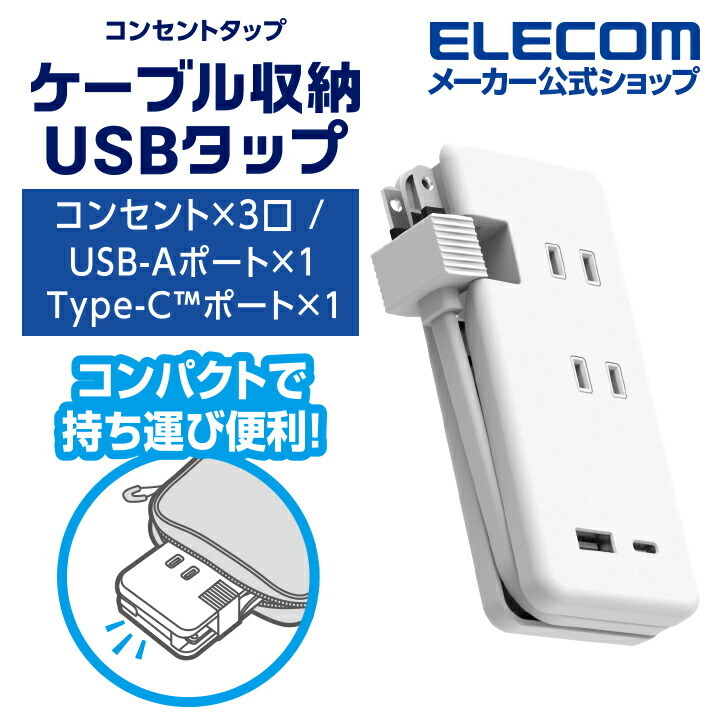 商品名 | エレコム モバイルUSBタップ 電源タップ コンセント 延長コード タップ 15W USB-A ×1+ USB-C ×1 3つのAC差込口 usb-c usb-A ホワイト 0.25m┃ECT-1802WH |