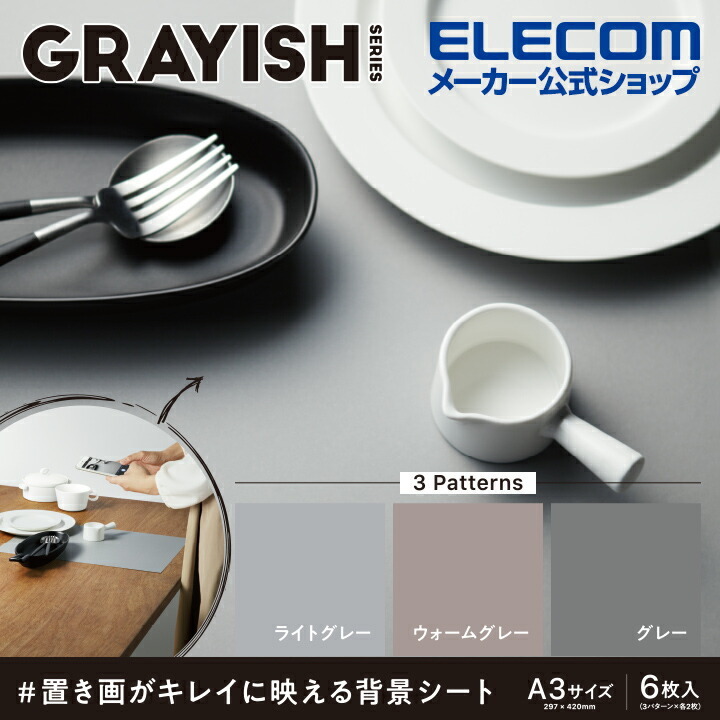 商品名 | エレコム 撮影用背景シート 置き画がキレイに映える背景シート インスタ スクリーン ライトグレー/ウォームグレー/グレー 6枚入(3パターン×各2枚)┃DGA-BPA3GY |