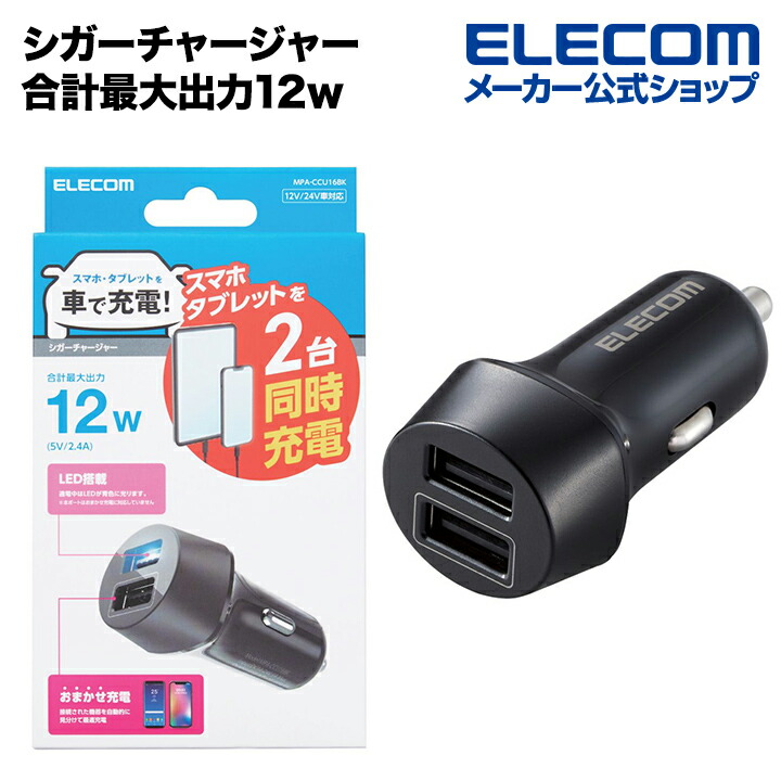 商品名 | エレコム スタンダード シガーチャージャー 車載 充電器 通電確認LEDランプ付き おまかせ充電 12W USB-A×2 ブラック┃MPA-CCU16BK |