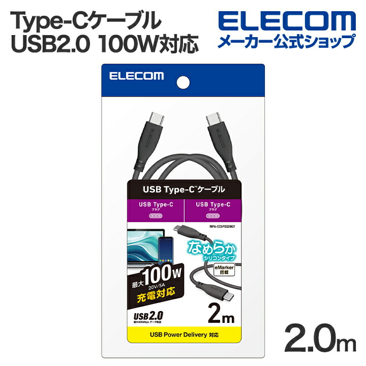 商品名 | エレコム USB Type-C USB2.0ケーブル タイプcケーブル c-c 100W対応 シリコン 2.0m グレー┃MPA-CC5PSS20GY |