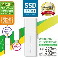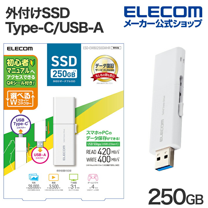 ■スマホの中の写真や動画も、挿すだけでかんたん保存!大量の写真や動画、ゲームソフトを保存できる外付けポータブルSSDです。開封後ほとんどのスマートフォンやパソコンでそのまま挿して使用可能。「初心者向けマニュアル」にすぐにアクセスできるQRシール付きで、初めてSSDを手に取る方にも安心してお使いいただけます。 特徴■SSD(ソリッド・ステート・ドライブ)とは、データを記録するストレージ(記憶装置)のこと。従来品のHDD(ハードディスク)と比べて、データの転送速度が速くコンパクトなボディが特長です。耐久性や静音性にも優れています。 ■容量はたっぷり250GB。写真であれば約28,000枚、動画は約3,500本、録画した地上デジタル放送のテレビ番組は約31時間、ゲームソフトの場合4本分を記録できます。 ■※写真:2400万画素・8.2MB/枚、動画:1分間・65MB(1080pHD/30fps)、ゲームソフト:50GB/本とした際の目安です。 ■開封後、挿すだけですぐに使用可能。出荷時にexFAT形式でフォーマット済みのため、iPhone、Androidスマートフォン、Windowsパソコン、Macなどで挿してそのまますぐに使えます。ケーブルやアダプターなどを別途用意する必要はありません。 ■選べるWスライドコネクター。スライド操作でUSB-AとUSB Type-C(TM)を切り替えられます。パソコン・スマートフォン・ゲーム機などさまざまなデバイスで使えます。 ■読み込み420MB/s、書き込み400MB/sの高速データ転送を実現。従来の外付けハードディスクと比べて約4倍の速度でデータを転送できるから、作業効率がぐっと上がります。 ※当社製HDD(ELP-GTV010UBK)との比較 ■初心者向けマニュアルへいつでもアクセス可能。基本操作の手順やソフトの使い方などを解説したマニュアルへ、付属のQRシールからすぐにアクセスできます。マニュアルはソフトのアップデートなども随時反映するため、いつでも最新の状態で確認できます。 ■もしものときも安心。誤操作でデータが消えてしまった際に、保証期間内で1回無償でデータを復旧できるサービス「データ復旧サービスLite」が付いています。 ■※データ復旧サービスLiteは、「データを削除した」など誤操作によるデータの消失で復旧対象物のデータが上書きされていない状態の時に限ります。誤操作以外の障害は有償のデータ復旧サービスとなります。 ■※データ復旧サービスLiteは、製品状態により必ずしもすべてのデータが完全に復旧することをお約束するものではなく、データ損害について当社は責任を負いかねます。 ■見られたくないデータを保護。パスワード自動認証機能付きセキュリティソフト「PASS(Password Authentication Security System)」を、エレコムホームページからダウンロードして使用可能です。 ■指定したパソコン(最大3台)で1度パスワードを設定すると、2度目からは面倒なパスワード入力をすることなくデータを保護することができます。 ■未登録のパソコンに接続した場合、パスワードの入力を要求。盗難や紛失時のデータ漏えいを防止します。 ■大容量で2種類のコネクターが一体でありながら、USBメモリとほぼ変わらないコンパクトさ。ペンケースやガジェットポーチにも十分入るサイズで、持ち運びにも便利です。 ■USB3.1(Gen1)/USB3.0/USB2.0への下位互換が可能で、そのまま接続可能です。 ■アクセス状態がわかるLEDランプを装備しています。 ■保証期間を「1年間」としているため、安心してご利用いただけます。 ■自社環境認定基準を1つ以上満たし、『THINK ECOLOGY』マークを表示した製品です。 ■環境保全に取り組み、製品の包装容器が紙・ダンボール・ポリ袋のみで構成されている製品です。 ■廃棄物削減に取り組み、製品に同梱する取扱説明書等をペーパーレス化した製品です。 仕様■対応OS(Windows):Windows 11/10■対応OS(mac):macOS Sequoia 15/macOS Sonoma 14/macOS Ventura 13 ■対応OS(iOS):iOS 18/17 ■対応OS(iPadOS):iPadOS 18/17/16 ■対応OS(Android):Android 14/13/12 ■対応ゲーム機:PlayStation(R) 4、PlayStation(R) 4 Pro、PlayStation(R) 5 ※PlayStation(R) 5のソフトデータは拡張ストレージから起動できません。 ■インターフェース:USB 5Gbps(USB3.2(Gen1)) ■コネクター形状:USB-A、USB Type-C(TM) ■容量:250GB ■データ転送速度:読み込み:最大420MB/s、書き込み:最大400MB/s ※当社環境での測定値 ※USB 5Gbps(USB3.2(Gen1))でご使用になるには、機器側がUSB 5Gbps(USB3.2(Gen1))に対応している必要があります。 ■出荷時フォーマット:exFAT ■セキュリティソフトウェア対応機種:Windows 11/10が動作するWindowsパソコン、およびmacOS Ventura 13/macOS Monterey 12/macOS Big Sur 11が動作するMac ■付属品:QRシール ■外形寸法:幅約68mm×奥行約22mm×高さ約8mm ■重量:約12g(本体) ■電源:USBバスパワー ■カラー:ホワイト ■保証期間:1年間 |