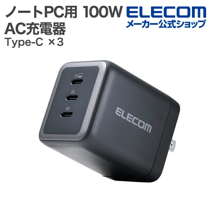 ■スマホもノートパソコンも、3台同時充電をこれ一つで!USB Type-C(TM)×3ポートを搭載したAC充電器です。USB Power Delivery 100Wの高出力で、ハイスペックノートパソコンをはじめ幅広い機器をしっかり充電できます。 特徴■3つの出力ポートを搭載。用途に合わせて接続先を使い分けられるから、スマートフォンやノートパソコン、タブレット、ワイヤレスイヤホンなどを組み合わせて同時に充電できるAC充電器です。 ■USB Type-Cポートへの1ポート接続時は、USB Power Delivery 100Wを出力。ハイスペックノートパソコン、ゲーミングPCなどを十分な速度で充電できます。 ■2ポート同時接続時は12W〜70W、3ポート同時接続時は12W〜70Wでの出力が可能。ノートパソコンやスマートフォン、タブレット、ワイヤレスイヤホン、電子タバコなど、幅広いデバイスを同時に充電できます。 ■GaN II(窒化ガリウム)を採用し、高出力ながらコンパクトサイズを実現。プラグ部分も折り畳むことができるため、バッグの中でもスペースを取らず、ビジネスでの外出やリモートワーク、出張、旅行など持ち運びにも便利です。 ■MacBook付属のUSB-C - MagSafe 3ケーブルも使用可能。MacBookの充電をスムーズに行えます。 ■USB Power DeliveryおよびPPS規格に対応。機器に応じて電圧、電流が変化するため、スマートフォンやタブレットはもちろん、Windowsノートパソコンも幅広い機種を充電できます。 ■※USB Power Deliveryとは、アダプターと接続機器間で情報をやり取りすることで、その機器間における最適な電力を選択し、高速充電を実現するUSB規格です。PPS(Programmable Power Supply)とは、0.02V単位で電圧を調整し、最適な電力で効率的に供給することができるUSB Power Deliveryのオプション規格です。 ■※本製品のUSB Power Delivery最大出力は100Wです。PPS(Programmable Power Supply)最大出力は100Wです。 ■Thermal Protectionを搭載し、製品温度の上昇を24時間監視・制御。自動で出力をコントロールし、お使いの機器を守ります。 ■本製品はUSB-IFのテストと同等のテストを当社独自で実施し、USB Power Delivery対応製品との高い互換性が保たれています。 ■電気用品安全法(PSE)認証品です。また、当社独自のテストを実施した、高い安全性が確認された製品になります。 ■電気用品安全法の耐トラッキング性の要求事項を満たしたコンセントプラグを採用しています。 ■※充電ケーブルは同梱していません。別途ご用意ください。 ■※機器本体や充電器が濡れた状態で充電すると、異常な発熱・焼損の原因となり大変危険ですのでおやめください。 ■※USB Type-C and USB-C are trademarks of USB Implementers Forum. ■自社環境認定基準を1つ以上満たし、『THINK ECOLOGY』マークを表示した製品です。 ■廃棄物削減に取り組み、製品に同梱する取扱説明書等をペーパーレス化した製品です。 ■環境保全に取り組み、製品の包装容器におけるプラスチック重量を、社内基準製品より20%以上削減した製品です。 ■環境保全に取り組み、製品の包装容器が紙・ダンボール・ポリ袋のみで構成されている製品です。 仕様■対応機種:各USB Type-C(TM)ポートからUSB Power Delivery 100WおよびPPS 100Wの規格内で充電可能なノートパソコン、スマートフォンなどの機器。2ポート以上同時接続時、合計最大100Wまでの出力で充電・給電可能な機器とその組み合わせ■コネクター形状:USB Type-Cポート×3 ■定格入力電圧:AC100〜240V、50/60Hz ■定格入力電流:2A ■定格出力電力(単独接続時):USB Type-C1/C2/C3ポート:最大出力100W、PPS最大出力100W ■定格出力電力(2ポート同時接続時(1)):USB Type-C1+USB Type-C2/C3ポート:合計最大出力100W、USB Type-C1ポート最大出力70W、PPS最大出力55W、USB Type-C2/C3ポート最大出力30W、PPS最大出力30W ■定格出力電力(2ポート同時接続時(2)):USB Type-C2+USB Type-C3ポート:合計最大出力24W、USB Type-C2/C3ポート最大出力12W ■定格出力電力(3ポート同時接続時):合計最大出力94W、USB Type-C1ポート最大出力70W、PPS最大出力55W、USB Type-C2/C3ポート最大出力12W ■定格出力電圧(単独接続時):USB Type-C1/C2/C3ポート:5V/9V/15V/20V、PPS出力5〜21V ■定格出力電圧(2ポート同時接続時(1)):[USB Type-C1+USB Type-C2/C3ポート接続時]USB Type-C1ポート:5V/9V/15V/20V、PPS出力5〜11V、USB Type-C2/C3ポート:5V/9V/15V/20V、PPS出力5〜11V ■定格出力電圧(2ポート同時接続時(2)):[USB Type-C2+USB Type-C3ポート接続時]USB Type-C2/C3ポート:5V ■定格出力電圧(3ポート同時接続時):USB Type-C1ポート:5V/9V/15V/20V、PPS出力5〜11V、USB Type-C2/C3ポート:5V ■定格出力電流(単独接続時):USB Type-C1/C2/C3ポート:5V/9V/15V時3A・20V時5A、PPS出力5〜21V時5A ■定格出力電流(2ポート同時接続時(1)):[USB Type-C1+USB Type-C2/C3ポート接続時]USB Type-C1ポート:5V/9V/15V時3A・20V時3.5A、PPS出力5〜11V時5A、USB Type-C2/C3ポート:5V/9V時3A・15V時2A・20V時1.5A、PPS出力5〜11V時3A ■定格出力電流(2ポート同時接続時(2)):[USB Type-C2+USB Type-C3ポート接続時]USB Type-C2/C3ポート:5V時2.4A ■定格出力電流(3ポート同時接続時):USB Type-C1ポート:5V/9V/15V時3A・20V時3.5A、PPS出力5〜11V時5A、USB Type-C2/C3ポート:5V時2.4A ■外形寸法:幅約55.5mm×