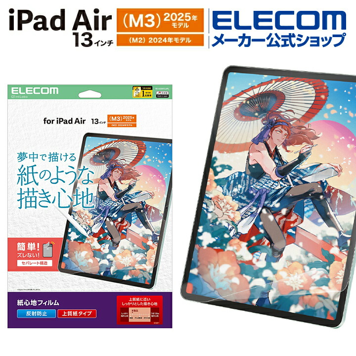 ■画面を傷や汚れから守る、指紋防止、反射防止タイプの紙心地フィルムです。特殊表面形状デザインにより、上質紙に鉛筆で描いたような描き心地を実現します。 特徴■画面を傷や汚れから守る、指紋防止、反射防止タイプの紙心地フィルムです。 ■特殊表面形状デザインにより、上質紙に鉛筆で描いたような描き心地を実現します。 ■ペン先が滑りすぎないため、しっかり線画が描きやすいです。 ■時間の経過とともに気泡が目立たなくなる、特殊吸着層を採用したエアーレス加工を施しています。 ■小さな気泡ができたときには、指などで押し出すことで気泡を抜くことができます。 ■指紋汚れを付きにくくする指紋防止コーティングを施しています。 ■フィルムを貼ったままでも端末操作ができるタッチスクリーン入力に対応しています。 ■貼り付け面にシリコン皮膜をコーティングし、接着剤や両面テープを使わずに貼り付け可能な自己吸着タイプです。貼りやすく、貼り直しも可能です。 ■端末の形状に合わせたサイズにカット済みなので、パッケージから取り出してすぐに使用可能です。 ■貼り付けの際ズレ防止の固定シールが付いており、位置決めが簡単。貼り付け面はセパレートカット構造のため貼り付けやすい加工になってます。 ■※フィルムを画面に貼り付けると薄く痕が残ったように見えますが、時間がたつと目立たなくなります。 ■フィルムがキレイに貼れる専用ヘラと、クリーニングクロス、ホコリ取りシールが付属しています。 ■自社環境認定基準を1つ以上満たし、『THINK ECOLOGY』マークを表示した製品です。 ■環境保全に取り組み、製品の包装容器が紙・ダンボール・ポリ袋のみで構成されている製品です。 仕様■対応機種:13インチiPad Air(M3)、13インチiPad Air(M2)■対応モデル番号:A3271、A3269、A3268、A2900、A2899、A2898 ■セット内容:画面保護フィルム(紙心地・反射防止・上質紙タイプ)×1、ホコリ取りシール×1、クリーニングクロス(乾式)×1、ヘラ×1 ■材質:接着面:シリコン、外側:PET |