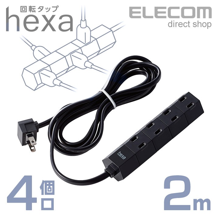 商品名 | エレコム 電源タップ 延長コード コンセント タップ 回転タップ hexa コンセントタップ 4個口 2m ブラック ブラック 2.0m┃T-HX7-2420BK |