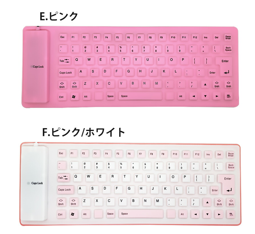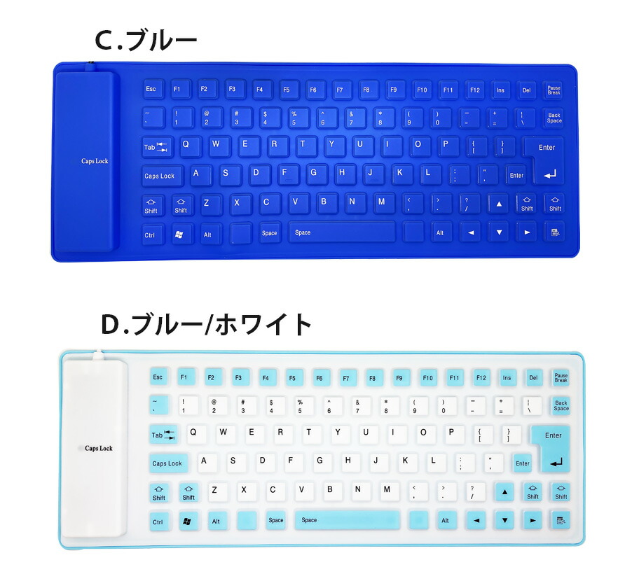 | 接続は、USBケーブルを使用するデバイスに差し込むだけの、プラグアンドプレイでとっても簡単。面倒な充電やペアリング、電池交換等は無しでご利用いただけます。 液体の侵入を防ぐ密封設計で、ジュースやコーヒなどを不注意にキーボードに溢しても安心、濡れたタオルで拭くだけで大丈夫です。 柔らかいシリコン材質で手触りが良く、無音なので、静かな場所でも周りを気にすることなく入力ができます。やわらかいシリコンキーボードは巻いてかばんの中に入れることができ、持ち運びが便利です。 |