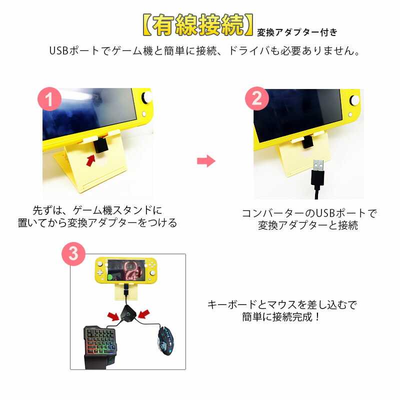 | シリコンキーボード×1点 ゲーミングマウス×1点 コンバーター×1点 コンバーター WEB日本語取扱説明書×1点 スタンド×1点 |