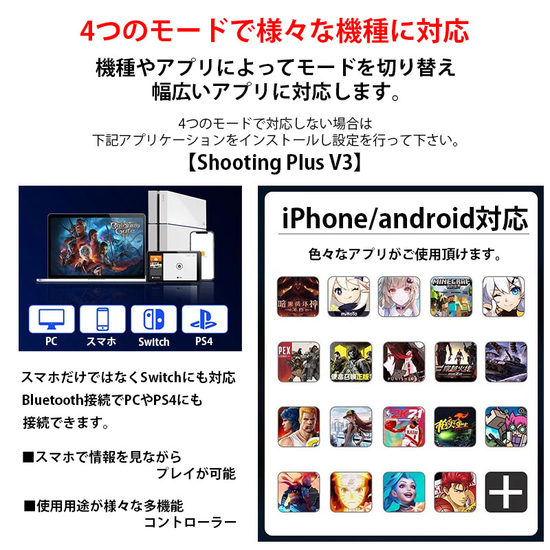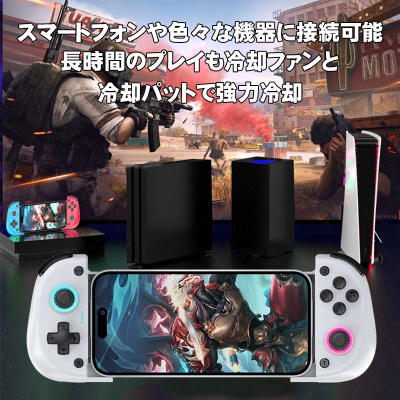 | ・スマートフォンとNintendo Switchに対応したゲームコントローラー。 ・iPhone/Androidに対応で色んなアプリが使用可能。 ・スライド式のコントローラーは様々な大きさのデバイスに対応。 ・大容量のバッテリーを搭載し、さらに冷却ファンと冷却パッドで、長時間のプレイが可能。 ・ファン部分はLEDに輝く仕様。 ・ジョイスティックの使用感はとても滑らかで高感度。 ・4つモードが搭載されています。 【Xbox Wireless Controller】モード RBボタン+ホームボタンを2秒以上長押し→ランプ3つが点滅で設定完了 【Pro Controller】モード RTボタン+ホームボタンを2秒以上長押し→上から下に点灯すれば設定完了 【JCHF-X5】モード Xボタン+ホームボタンを2秒以上長押し→上から3つ目が点滅で設定完了 【DUALSHOCK4 Wireless Controller】モード Bボタン+ホームボタンを2秒以上長押し→上から4つ目が点滅で設定完了 (※上記4つのモードで対応しない場合は【Shooting Plus V3】をインストールし設定してください) ・上記4つのモードによって様々な機種やアプリに対応、色々なゲームが出来ます。(※全てのアプリ/ゲームが対応しているかは保証しかねます/また対応アプリについてのご質問にもお答えしかねます) ・本体ケースが付いているので保管や持ち運びがラク。 |