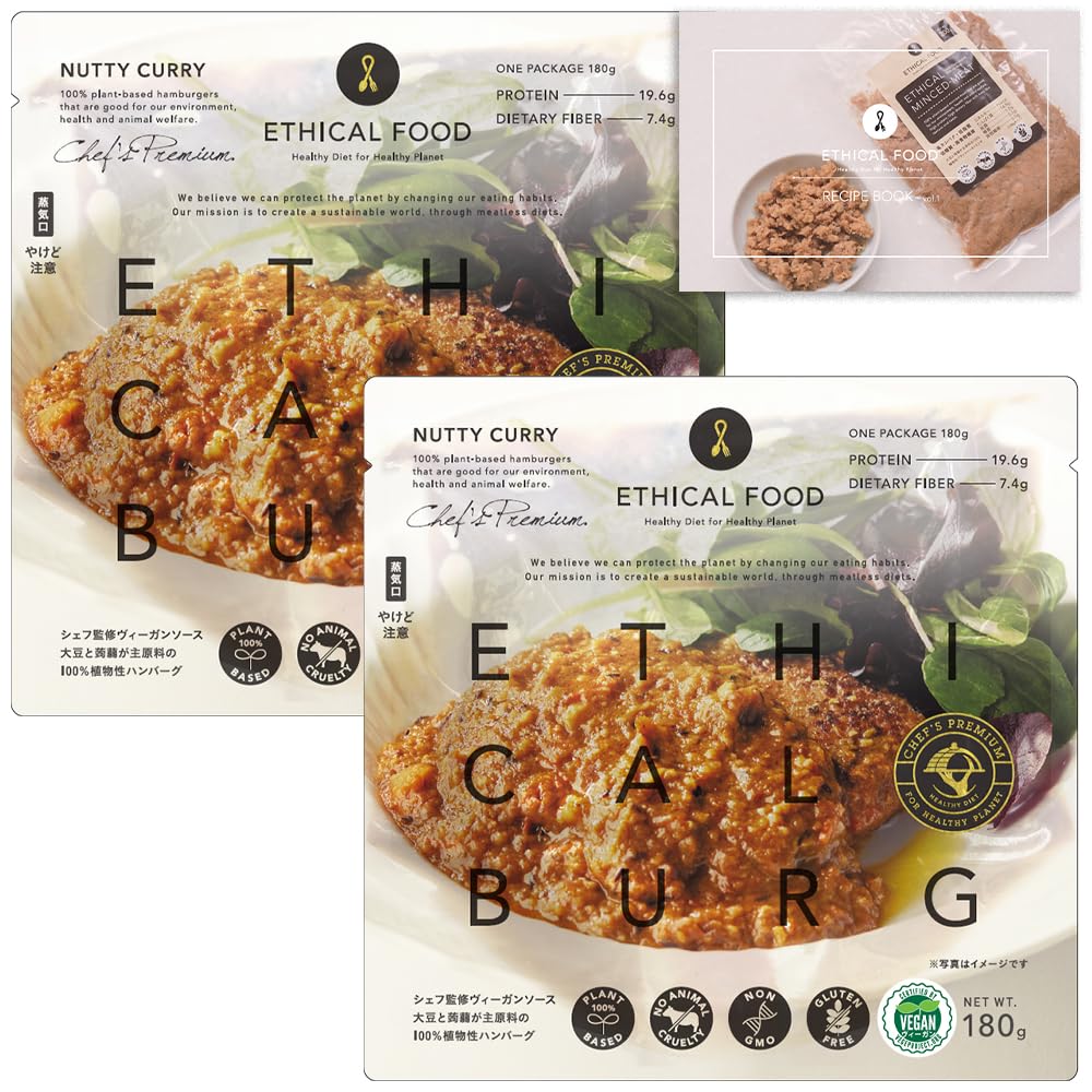 商品名:ETHICAL FOOD エシカルバーグ シェフズプレミアム ナッツィカリー 大豆ミート (リニューアル / 180g / 2包) ヴィーガン ハンバーグ (植物性代替肉/動物性原料不使用) レトルト ヘルシー (食物繊維/低カロリー) 常温保存