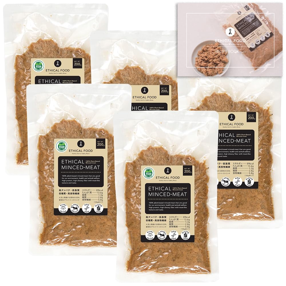 商品名:ETHICAL FOOD エシカルミンチ 大豆ミート (リニューアル / 200g / 5包) ヴィーガン ミンチ (植物性代替肉/動物性原料不使用) レトルト ヘルシー (食物繊維/高タンパク) 常温保存 レシピブック付き