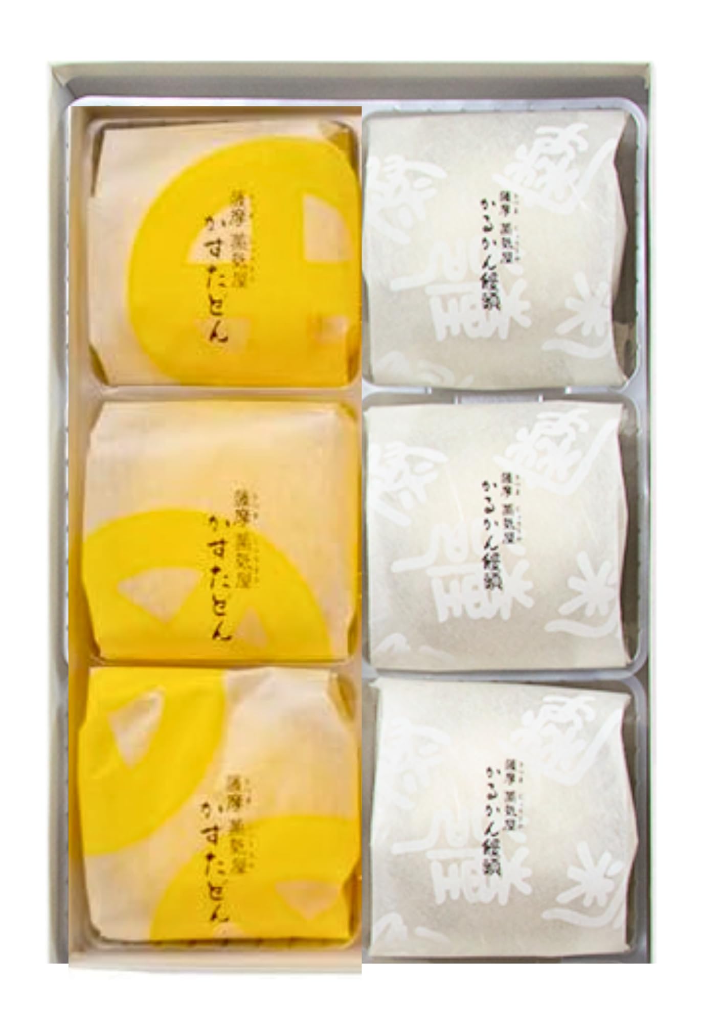 薩摩蒸気屋で人気の銘菓、かすたどんとかるかん饅頭の詰め合わせセットです。 鹿児島で定番のお土産、かすたどんと かるかん饅頭のセットなので、お土産や贈り物におすすめです。2種類が楽しめるセットです。 ■かすたどん 鹿児島産の卵をたっぷり使ったカスタードクリームをふんわりスポンジで包み込み可愛く仕上げました。 トロリとしたカスタードクリームのソフトな風味が特徴の蒸し菓子です。3才からお年寄りまで喜ばれる味がほのぼのとお口に広がります。 常温のままでも、少し冷やしてもおいしく頂けますが、冷たく凍らせますとシャーベットのようになりちがった味わいでおいしくお召し上がり頂けます。 ■かるかん饅頭 山芋をふんだんに使用した伝統の味と匠の技、薩摩蒸気屋のかるかん饅頭です。 薩摩銘菓かるかんに、国内産の小豆あんが入ったおまんじゅうです。 素材が活きているしっとり素朴なおいしさをお召し上がりください。 ■賞味期限 かすたどん:発送日より7日 かるかん饅頭:発送日より7日 ■商品サイズ かすたどん: 直径約6.5cm×高さ約3cm、約50g かるかん饅頭: 直径約6cm×高さ約3cm、約58g ■製造販売者 株式会社薩摩蒸気屋 ■内容量 6個入り(かすたどん3個、かるかん饅頭3個)