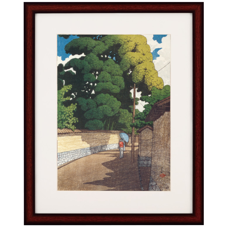 「旅みやげ第二集」の版。青空に入道雲、陽が射す木々。日傘をさす女性が趣ある路地を歩く夏の一景が叙情的に描かれた。