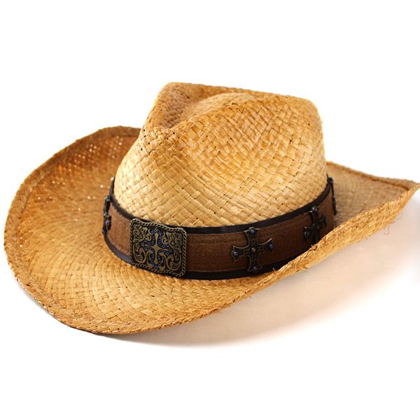 帽子 メンズ レディース ハット テンガロンハット 帽子 ラフィア カウボーイハット クロス バックル 夏 麦わら帽子 ぼうし ナチュラル