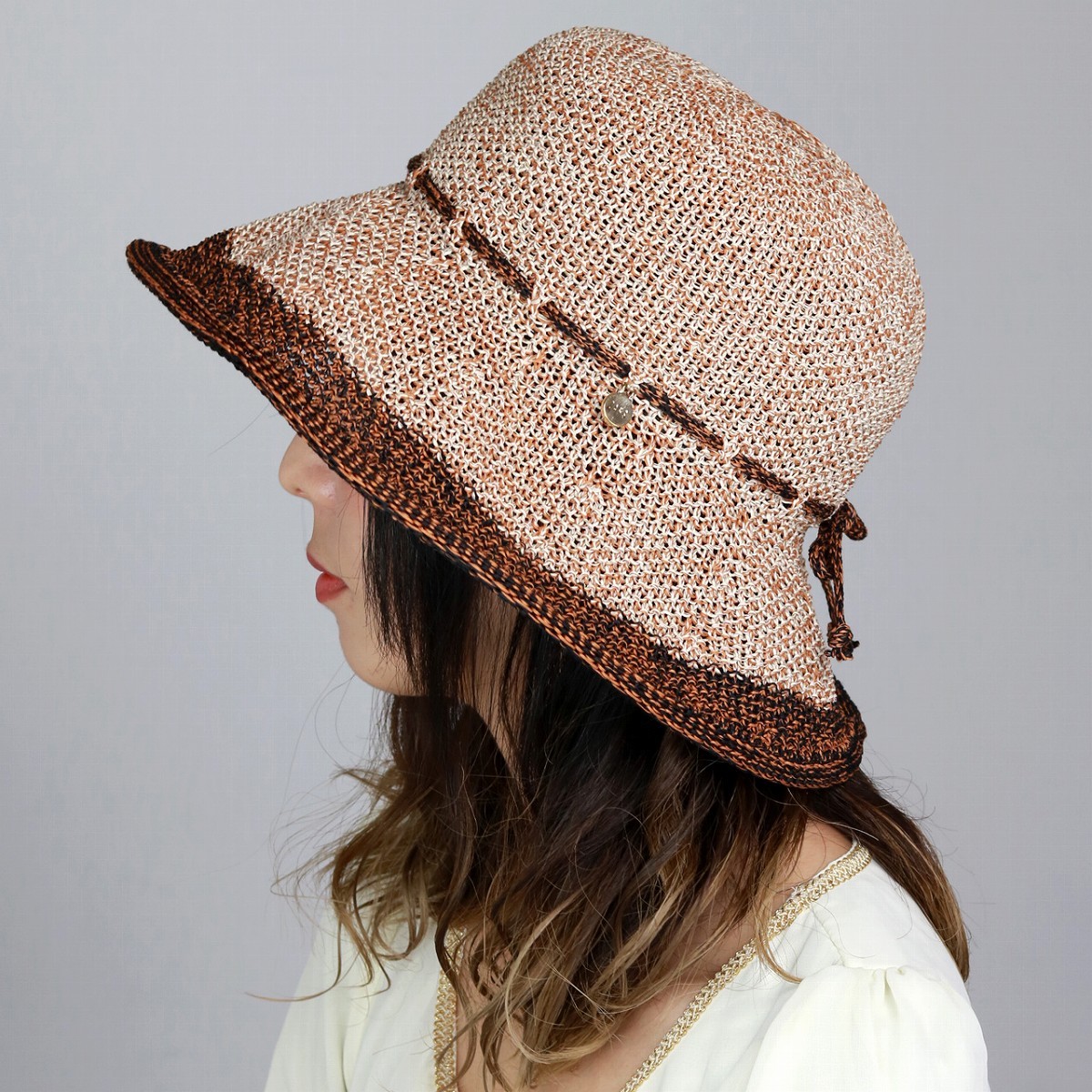 | 色味 | メーカー表記は黒ですが、本体は薄いベージュと茶色、リボンとツバの端は黒と茶色の混合です。金のチャーム付き。 | |