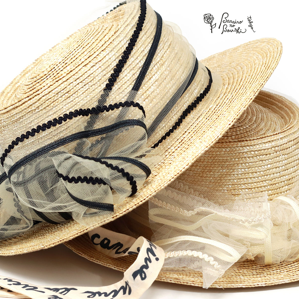 | 色味【アイボリー】 | 本体は籐のようなナチュラルなベージュで、全体的にやや艶があります。濃淡の有るベージュの麦で編まれたブレードなので、杢柄のように見えます。腰リボン部分はクリーム色のチュールに、クリーム色のブレードテープが飾られています。顎紐部分は白地に黒の手書き風英字プリントです。 | |