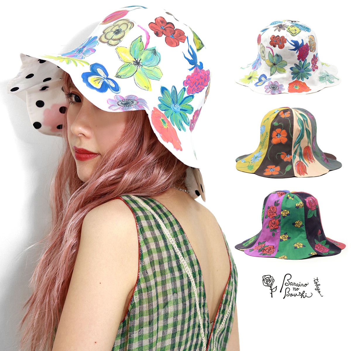 | 色味【ビビット】 | 本体は様々な色地にブルーや赤、イエローなどカラフルな色で手描きのお花柄がプリントされています。全体的にはっきりとした色味です。裏地は黒地に白のドット柄です。 | |