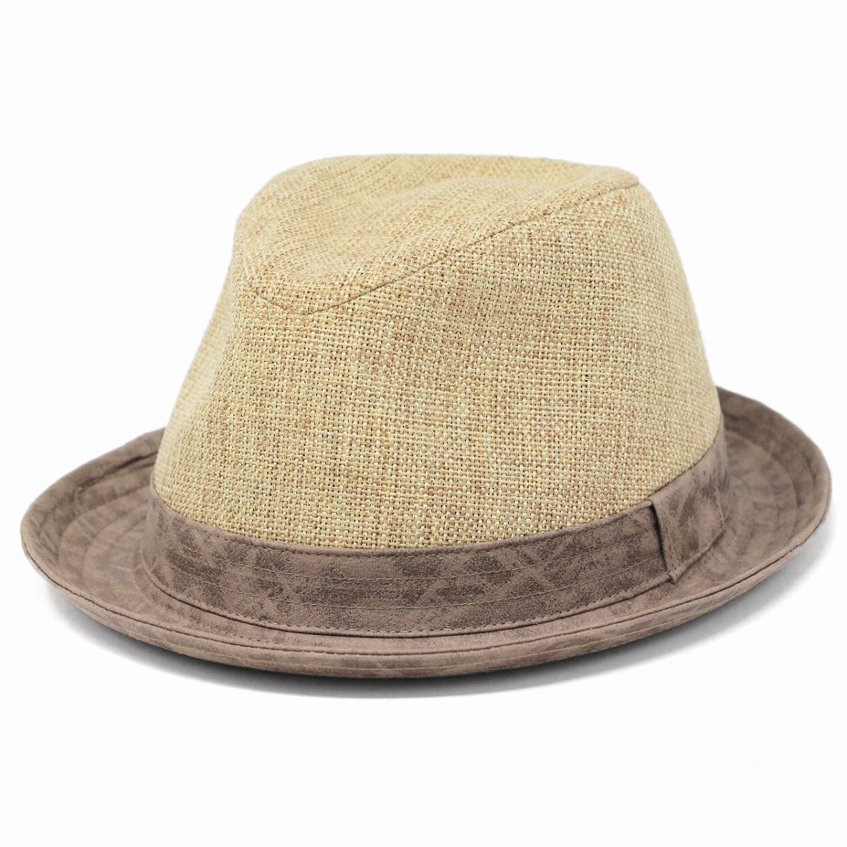 本体部分に天然素材風の生地をつかった春夏らしく涼し気な印象のハットです。本物の天然素材を使わず生地のハットにすることにより扱いやすくなり、真夏だけではなく春から夏にかけて長いスパンで楽しんでいただけます。クラウン部分とは別にベルト部分とつば部分の生地を変えたデザインがおしゃれですね。