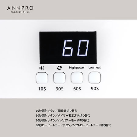 通常照射秒数のほか、ハイパワーモード、ローヒートモード、ソフトローヒートモードを搭載。ハイパワーモードは顔料の多いジェルの硬化に、ローヒートモードはビルダーや厚みを出す施術で熱さを感じやすい方に、ソフトローヒートモードは硬化熱に敏感な方におすすめです。