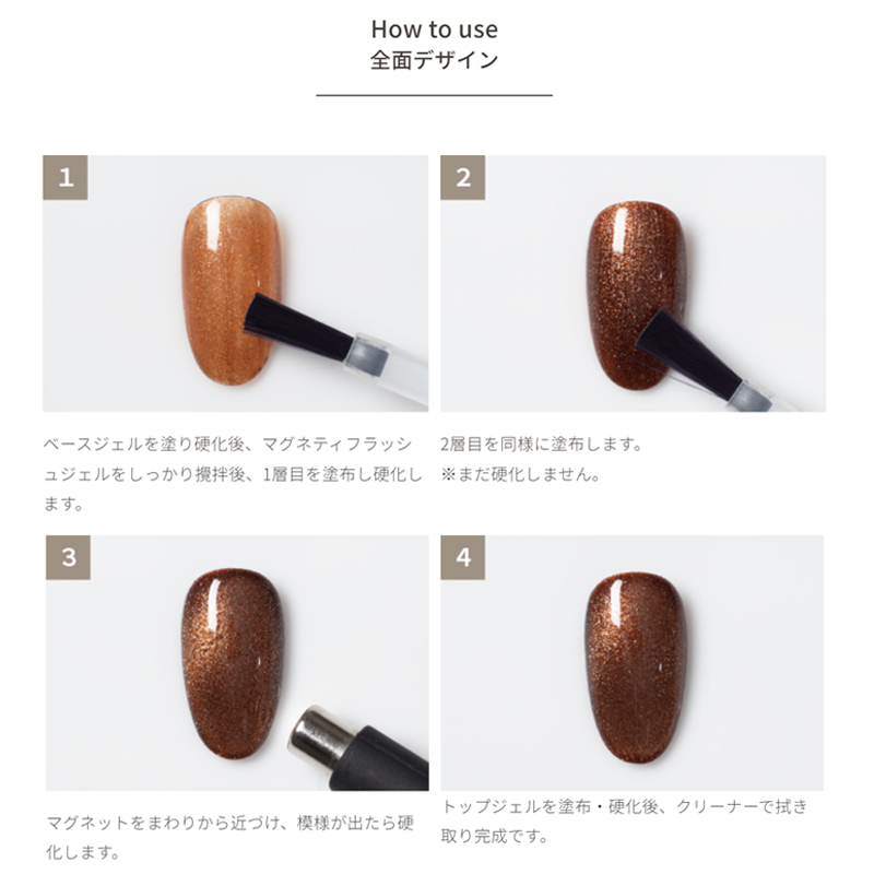 専用のマグネットを使用すると浮かび上がる光の筋と、光を反射するフラッシュグリッターが合わさり美しい輝きを放つ不思議なジェル。