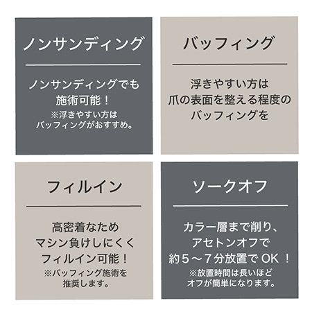 ソフトジェルタイプ UV約1分 ハイブリッド約30秒 ソークオフタイプ ノンサンディング フィルイン可