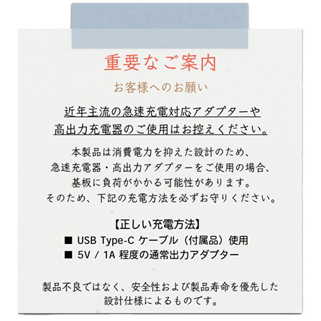 ・充電時間:約1.5〜2時間(5V/1A出力アダプター使用時)