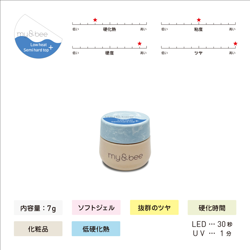 マイビー my&bee ローヒートセミハードトッププラス 7g トップジェル 艶 ツヤ 強度 硬化熱軽減 ジェルネイル トップコート セルフネイル セミハードトップジェル ソークオフ レベリング ネイルサロン ネイリスト うるうるの艶 薄い爪 新品 送料無料