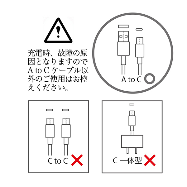 ・充電時、故障の原因となりますので、AtoCケーブル以外のご使用はお控えください。