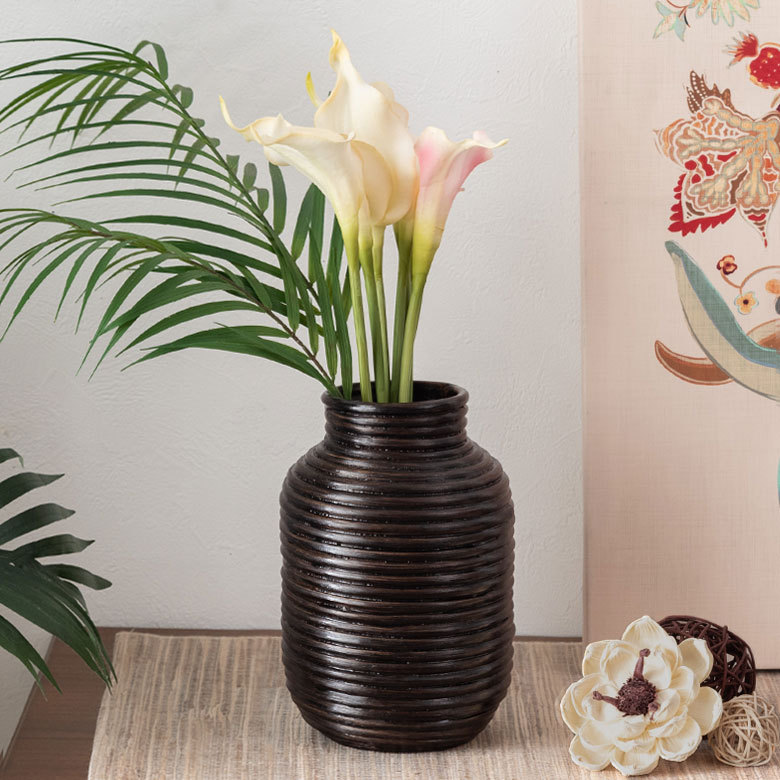 水を入れることはできないので生花を飾ることはできませんが、造花を飾るのにおすすめ。ダークブラウンなので、リアル造花やドライフラワー、アートプランツによく合います。なにも挿さずそのまま壺オブジェとしてインテリアにしても◎