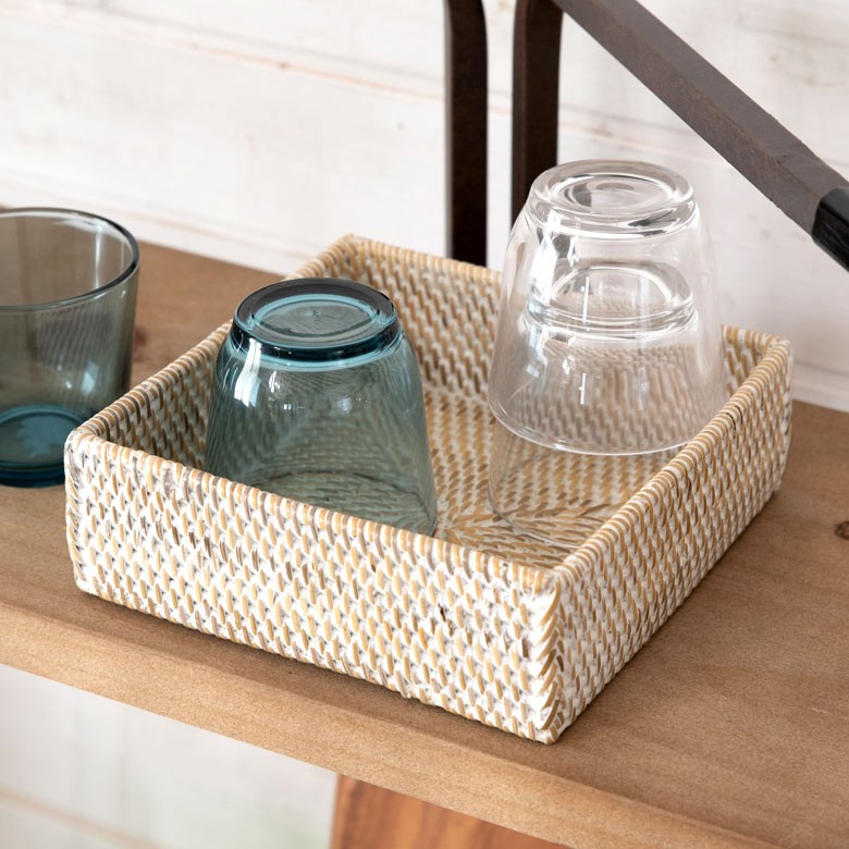 本来のラタンの編み目を活かしつつ、ホワイトウォッシュ加工を施した、バリ島生まれのラタンシリーズ。ラタンのナチュラルな質感はそのままに、爽やかでシャビーな雰囲気が魅力!フラットなスクエアの使いやすいトレーは、日用品や小物などをまとめて収納するのに便利です。