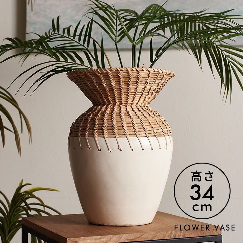 インドネシア・ロンボク島の職人たちが、伝統技法を守りながら手作業で生産する陶器。良質な土を精製し、ろくろで形作った後、藁をかぶせて直火で焼き上げる独自の製法で、温かみのある仕上がりが特徴です。この陶器にラタンを組み合わせたのが、こちらのフラワーベース。個性あるデザインは素朴ながらも存在感があり、ドライフラワー用の花瓶やオブジェとして活躍します。ユーカリやパンパスグラスを飾れば、ボヘミアンやナチュラルな雰囲気に。